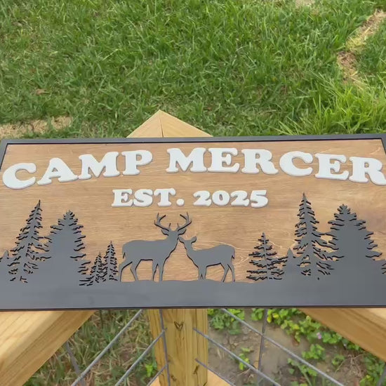 Bring rustic charm to your cabin, lake house, river house, hunting camp, man cave, or bar with this custom wood camp sign. Each sign features deer and pine tree silhouettes with bold raised lettering for a warm, outdoorsy look. Personalize with your camp name, family name, house welcome, and established year to make it truly yours. Perfect for gifts, lodge décor, or a unique welcome sign, this 23"x11.5" handmade piece adds character to any space. Built to last and crafted with care, it’s a one-of-a-kind sign that fits your style.