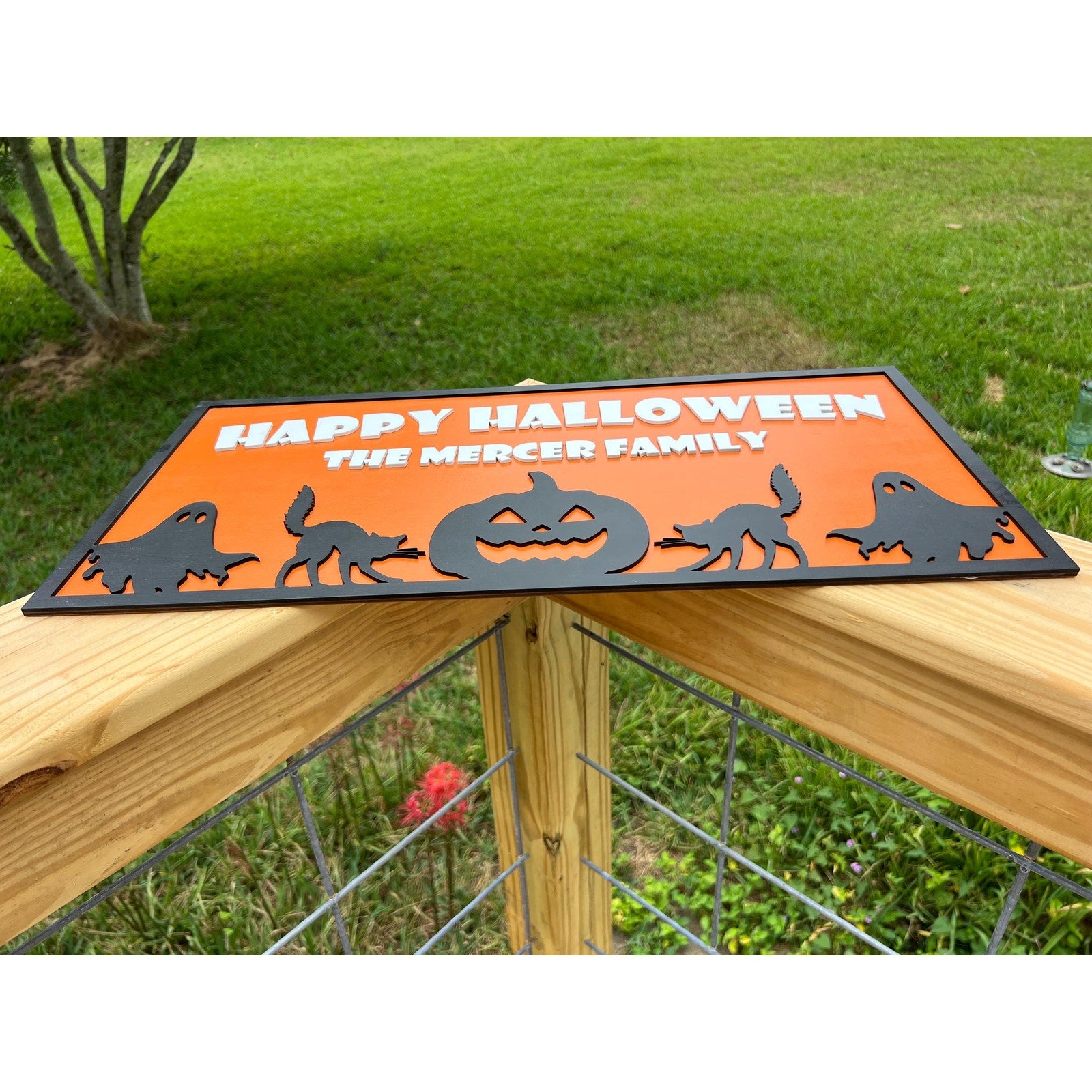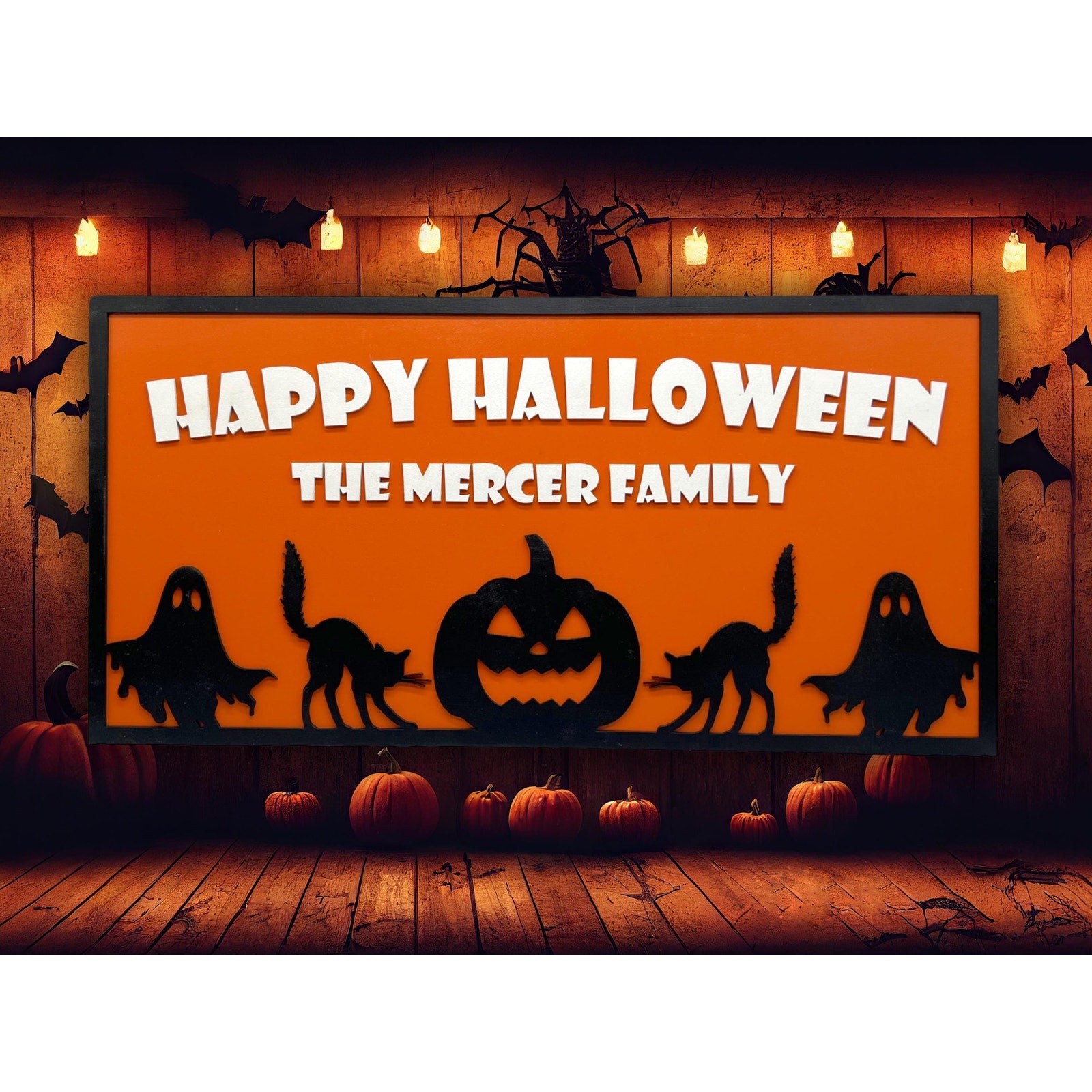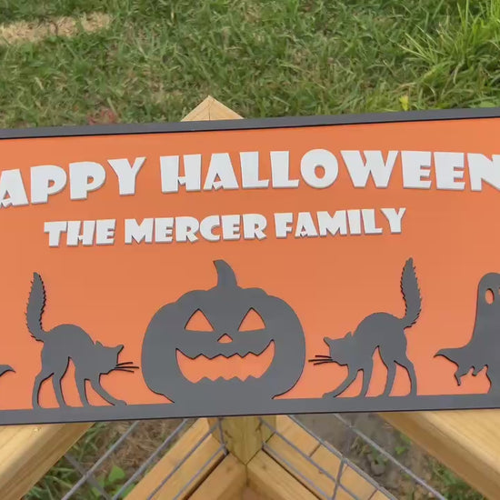 Add a spooky touch to your home this Halloween with a custom family name sign! This handmade 23"x11.5" wooden plaque features Halloween silhouettes of black cats, ghosts, and a carved pumpkin on a bold orange background. Perfect for your front door, porch, wall, or party décor. Each sign is personalized with your family name, making it a fun and unique decoration for years to come. If you’d like different wording or design adjustments, please message me for custom options. Durable, eye-catching, and festive—this personalized Halloween sign is sure to delight trick-or-treaters and guests!