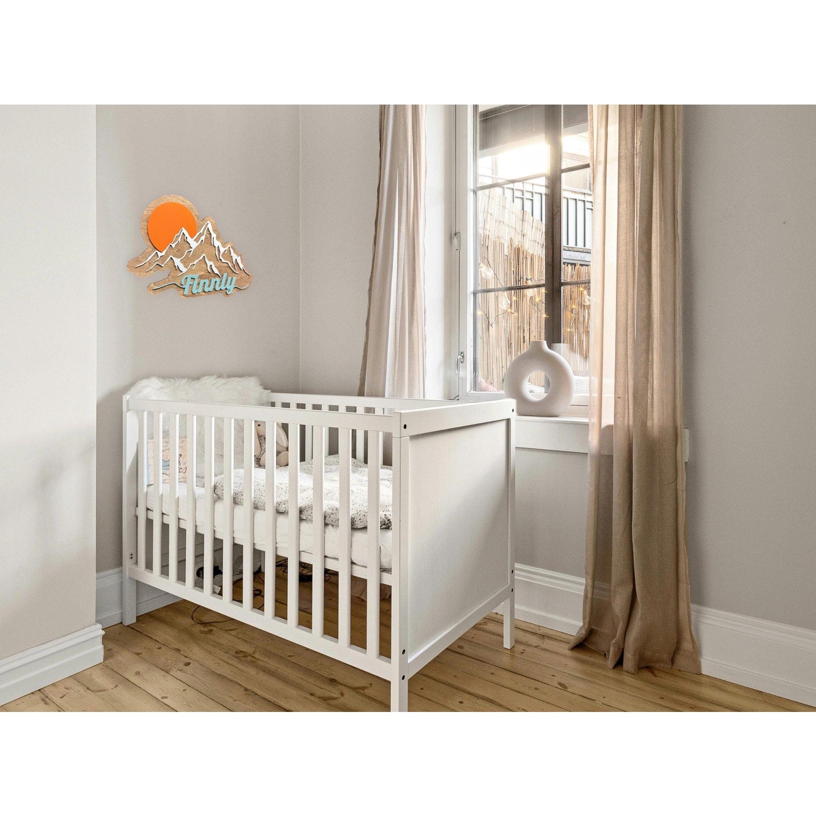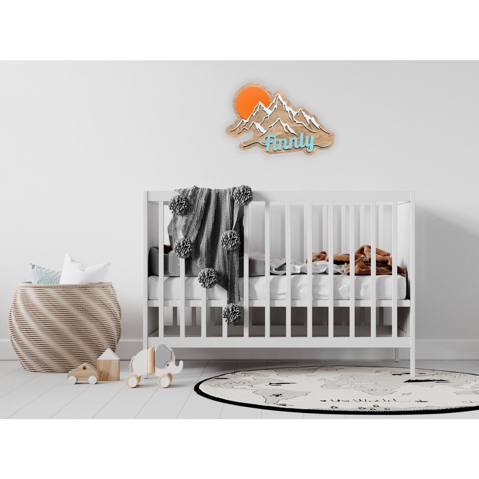 Bring a touch of adventure and warmth to your child’s space with this handcrafted mountain wall sign, perfect for a nursery, kids’ bedroom, or playroom. Made from quality layered wood, the design features a rustic mountain range with snowy accents, a vibrant orange sun, and your child’s custom name in bold lettering.