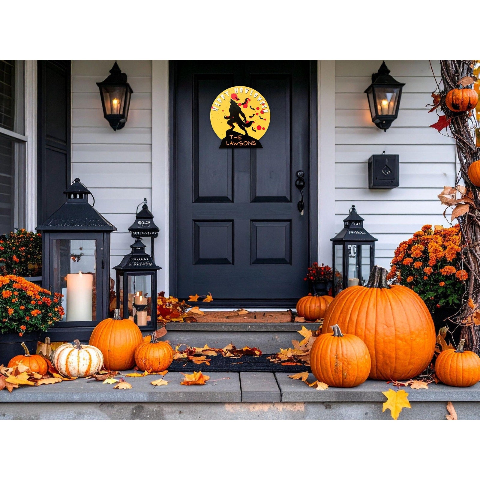 Happy Howloween Halloween Sign Personalized Halloween Werewolf Wall Decor with Family Name Rustic Wooden Door Sign