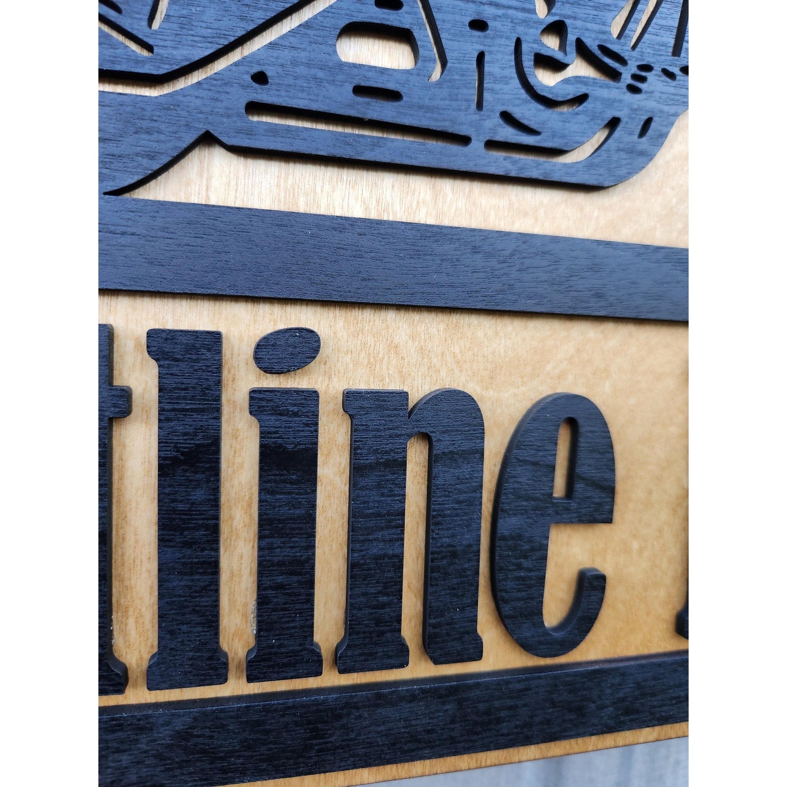 This custom biker sign features a skeleton riding a chopper, laser-cut and layered from birch wood. It’s finished to show the natural wood grain for a bold, rugged look that fits any motorcycle garage, man cave, or club wall. The text in the bottom box, shown here as "Rustline Riders", can be changed to whatever name or phrase you want. Add your club name, garage name, or a personal saying. You can use up to four words. Just enter your wording exactly how you want it in the personalization box when you order.